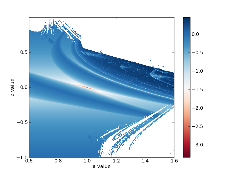 The big swaths of flat white are regions where the system becomes unbounded. It's interesting that the bottom right portion has some structure to it that's possibly fractal. The top right portion, between b=0.0b=0.0and b=0.5b=0.5 and a=1.0a=1.0 to a=1.6a=1.6 is really the only region on this image that's chaotic (where the exponent is non-negative and greater than zero). There's a lot more structure here to look at but I'll leave that to you. As a followup it'd be cool to zoom in on the bottom right corner and run this again.